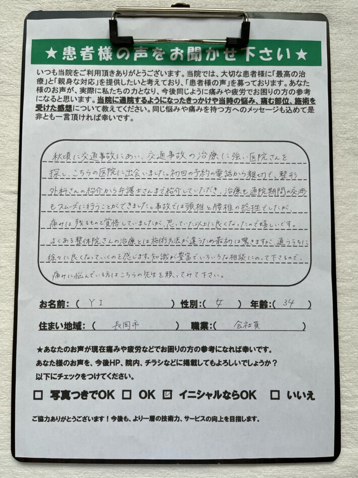 事故では頸椎と腰椎の捻挫でしたが、痛みは残るものと覚悟していましたが、思っていた以上に良くなったので嬉しいです。