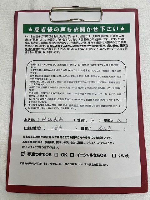 前歴のあるムチウチ症での「漫然治療」体験から「根本治療」を求めて「すがわら接骨院」を訪れました。