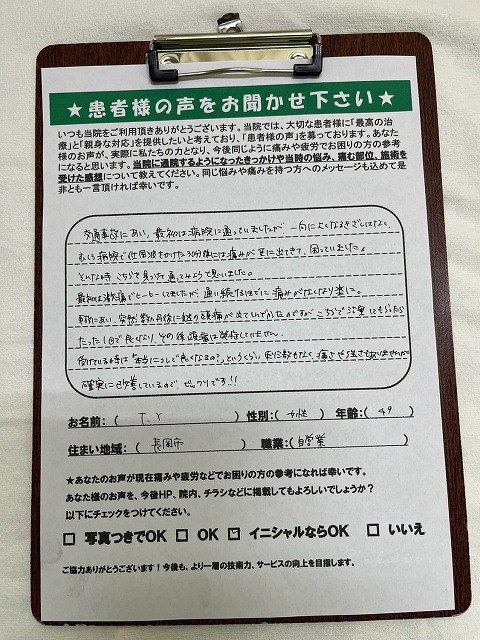 交通事故に遭い、最初は病院に通っていましたが、一向に良くなる兆しはなく、むしろ病院で低周波をかけた30分後には痛みが更に出てきて、困っていました。